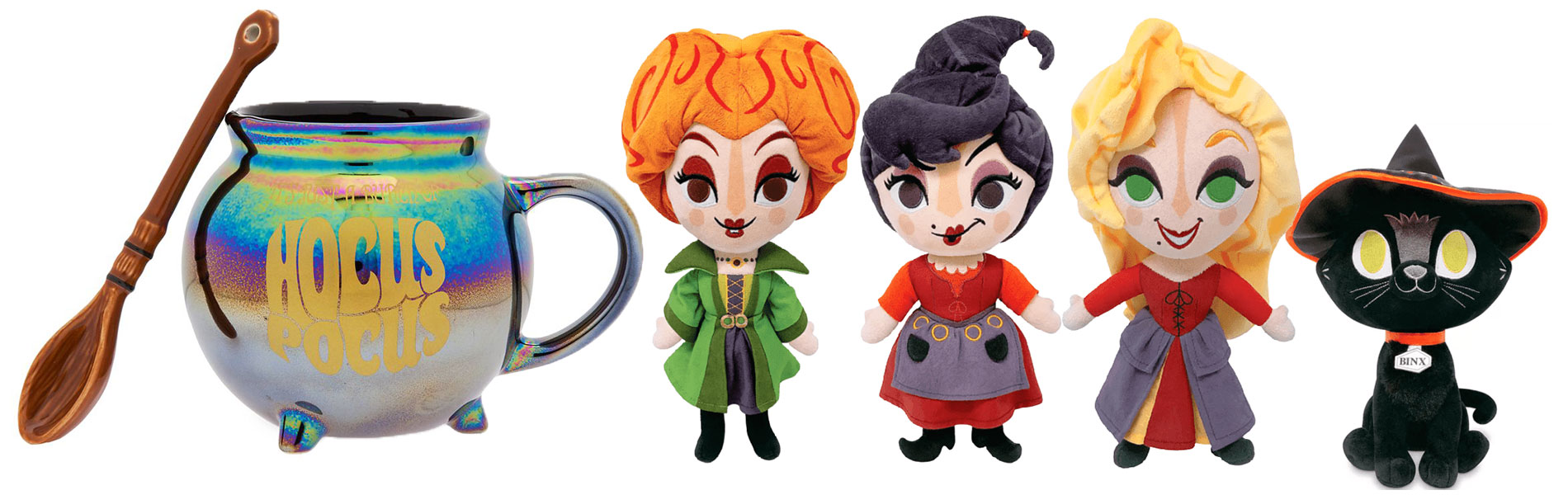 Ponuda darova Hocus Pocus u trgovini odaje počast trima voljenim vješticama filma, od meke igre Winifred Small do kompleta kostima Sarah Sanderson za odrasle do Funko Danija s Binx Popom! Kolekcija također uključuje šareni novčanik, preklopni gornji dio dugih rukava i kromiranu šalicu Hocus Pocus u obliku kotla.
