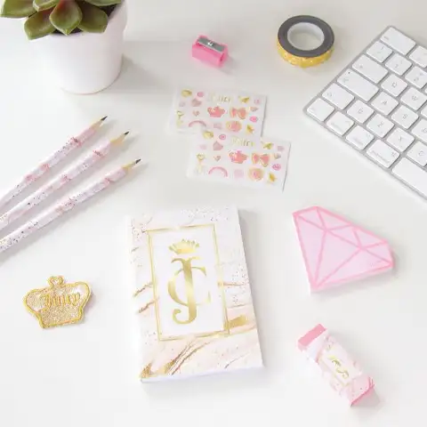 Vaše dijete sada može postati bogato sa ovim stvarno popularnim, vrhunskim Juicy Couture Deluxe priborom. Možete isprobati trendi boje poput sjajnog zlata, ružičaste i čisto bijele. Elegantna knjižica od 120 stranica, karbonska olovka sa tri gumice, zlatna svjetlucava traka, gumica, šiljilo, flaster, set naljepnica i samoljepljiva bilježnica dio su seta. Tko će biti najbolji u razredu? Može biti čak i izvrstan izbor kao poklon.