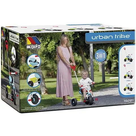 Čak i mališani mogu upoznati iskustvo vožnje biciklom zahvaljujući ovom velikom triciklu, a sve to mogu učiniti u potpunoj sigurnosti na najveće oduševljenje roditelja. Tricikl Urban Trike sa svojim veselim bojama i sigurnim dizajnom napravljen je za djecu od deset mjeseci. Pedala za naslon za noge na prednjem kotaču jednostavna je za upotrebu, dok veliko plastično sjedalo čini udobnom za djecu. Sigurnosni pojas koji se može pričvrstiti na sjedalo, kao i držač podesive duljine također doprinose sigurnosti.