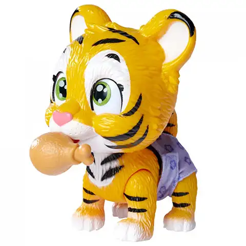 Nije baš lako udomiti tigra, jer ga je pravi izazov pravilno odgojiti, ali djeca su sasvim sigurna da će taj problem vješto riješiti. Prije nego što date ime svom malom ljubimcu, morate odrediti je li djevojčica ili dječak. Da biste to učinili, namočite šapu i vidjet ćete da postaje ružičasta ili plava. Mali tigrić iskričavih očiju još je jako mali i nosi pelenu u koju naravno i piški. Dajte mu piće i nahranite ga slasnim pilećim batakom, a zatim mu promijenite pelenu čija unutrašnjost požuti kad je puna. Osim tigra, set igračaka sadrži i tri iznenađenja koja mogu biti korisna za njegovu njegu i hranjenje, kao i plahtu za udomljavanje.