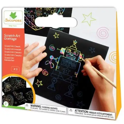 Paket koji sadrži Sycomore tehniku ​​slikanja grebanjem nudi vrlo posebnu kreativnu priliku za kreativnu djecu. Paket sadrži pet stranica sa različitim slikama, čija je cijela površina crna, samo je nekoliko slabašnih pomoćnih linija korišteno kao pomoć mališanima. A jedini zadatak je uz pomoć grebalice koja se nalazi u setu ići po linijama i tako otkriti obojenu površinu ispod crnog sloja, a konačni oblik crteža postaje vidljiv. Izrada skice također razvija kreativnost, maštu i spretnost.