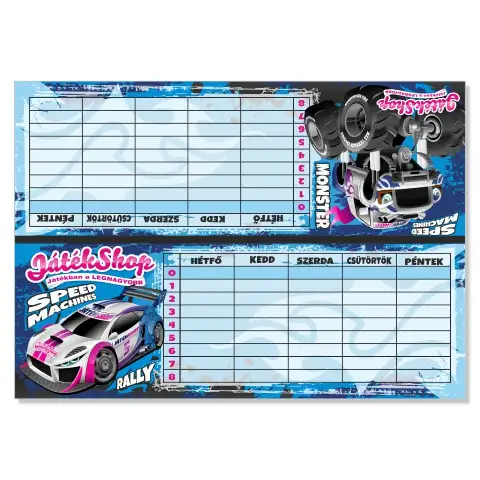 Sad si možeš nabaviti ovaj turbo raspored sati, koji može puno više od običnog rasporeda! Osim što je atraktivnog dizajna, koji uključuje trkaći auto i Monster Truck kamion, na njemu se nalazi i raspored sati za oba turnusa (na kojem su ostavljena polja za nulti i osmi sat). Na stražnjoj strani možeš naći puno korisnih stvari: tablicu množenja, grčka slova, ravnalo, kutomjer, a za razbibrigu, kad se odmaraš, stavljena je i društvena igra. Zaista, ovaj raspored ima sve što ti treba na jednom mjestu!
