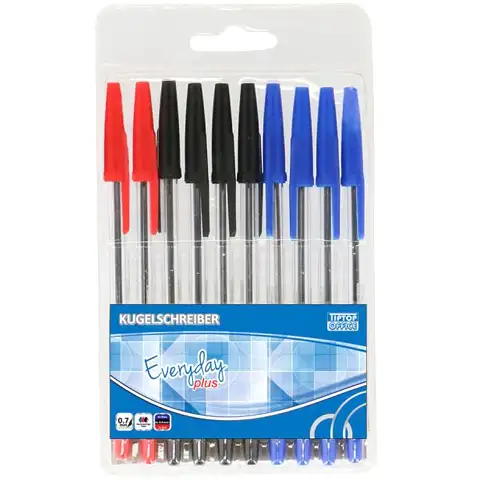 Izvrstan izbor za školsku, uredsku i kućnu upotrebu, ovaj set kemijskih olovaka dolazi u klasičnom dizajnu i dolazi u tri različite boje. Plastični poklopac ima ukupno 10 kemijskih olovaka, uključujući 4 olovke napunjene plavom bojom, 4 olovke napunjene crnom i 2 olovke napunjene crvenom tintom. Olovke imaju čep iste boje kao i tinta, koji ih štiti od oštećenja i dehidracije. Debljinu vrha od 1 mm.
