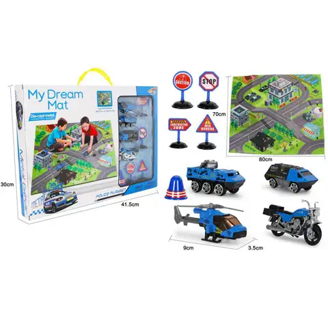 Mnogo su zanimljivija od običnih malih automobila policijska specijalna vozila, a u ovom paketu naći ćete od oklopnih vozila do helikoptera. Kako bi vam igra bila još zanimljivija u setu se nalazi i jedan tepih. Cijeli set je izrađen vrlo kvalitetno i detaljno, stoga vjerujemo da će vašim mališanima dugo biti na raspolaganju.