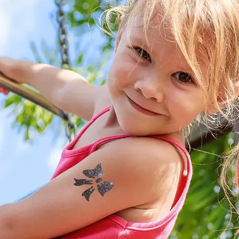 Jednostavna za upotrebu, a izuzetno spektakularne tetovaže djeca mogu napraviti sa ovim crnim kozmetičkim svjetlucavim prahom, od kojih se tri mogu naći u kompletu dodatne opreme. Staklenku sa svjetlucavima lako je otvoriti i sigurno zatvoriti, čineći ukupno 60-80 sjajnih tetovaža. Svjetlucavi puder možete lako nanijeti na kožu ljepilom, koje zatim može trajati tjednima kao ukras.